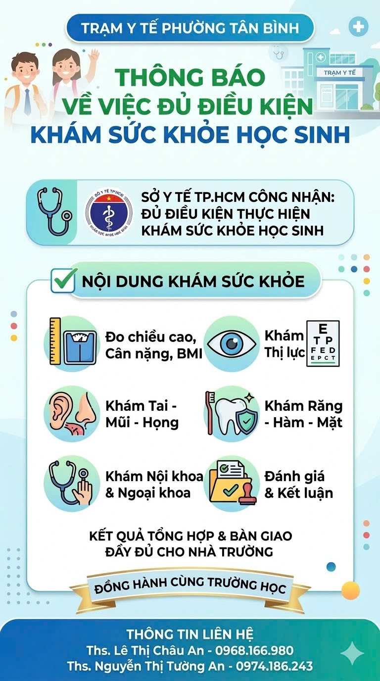 Trạm Y tế phường Tân Bình trân trọng thông báo: đơn vị đã được Sở Y tế TP. Hồ Chí Minh công nhận đủ điều kiện thực hiện khám sức khỏe học sinh theo quy định hiện hành. Đây là cơ sở góp phần chăm sóc và bảo vệ sức khỏe toàn diện cho học sinh trên địa bàn.