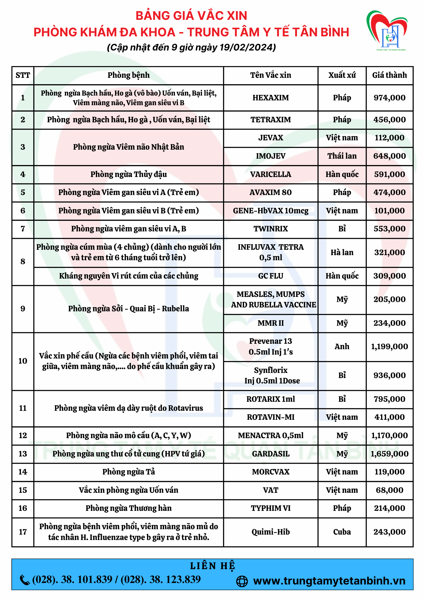 Bảng giá vắc-xin Phòng khám Đa khoa - Trung tâm Y tế Tân Bình (cập nhật 19/02/2024)