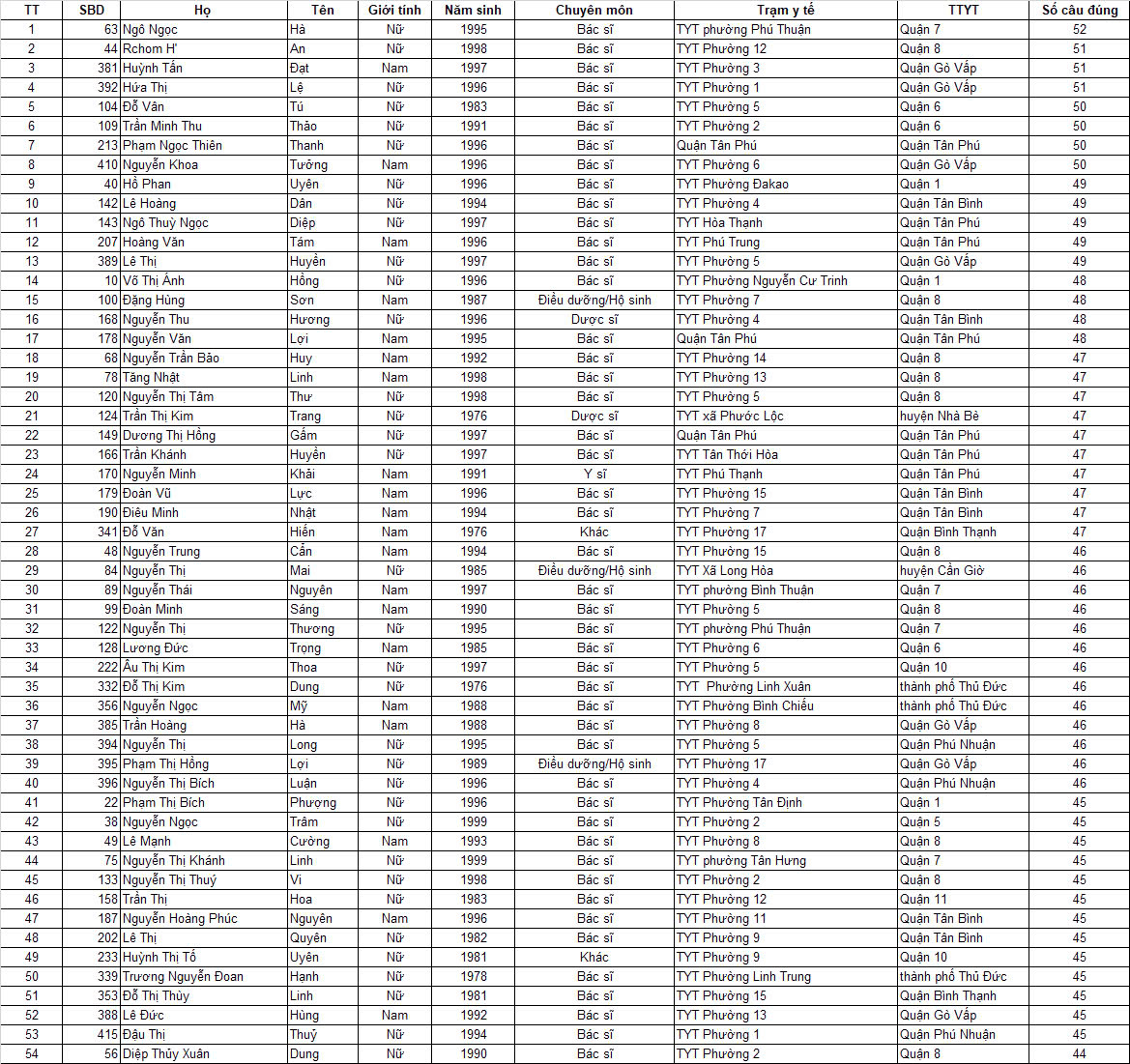 Theo thống kê từ Ban Tổ chức, 113 thí sinh đã đạt điểm cao nhất được chọn vào Vòng 2 thuộc 22 Trung tâm Y tế quận, huyện, thành phố Thủ Đức. Có 04 Trung tâm y tế có thí sinh vào Vòng 2 cao nhất, dẫn đầu là TTYT Quận 8 với 15 thí sinh, kế đến TTYT Gò Vấp 10 thí sinh, TTYT Tân Bình và Tân Phú có 09 thí sinh. Trong đó có 63 thí sinh hiện đang là Trưởng, Phó Trưởng trạm và 50 thí sinh còn lại là đối tượng được quy hoạch.