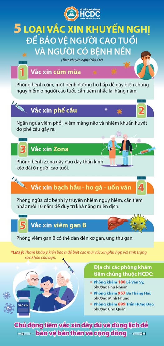 Người cao tuổi và người có bệnh nền thường có hệ miễn dịch yếu hơn, dễ mắc các bệnh truyền nhiễm và gặp biến chứng nặng. Việc tiêm vắc xin đầy đủ, đúng lịch không chỉ giúp bảo vệ sức khỏe bản thân mà còn góp phần bảo vệ cộng đồng.