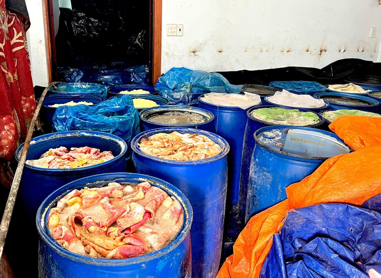 Qua kiểm tra, lực lượng chức năng ghi nhận tại tầng 4 và 5 của căn nhà số 840 có gần 100 phi nhựa loại 200 lít chứa da, mỡ lợn đang trong tình trạng phân hủy, bốc mùi hôi thối nồng nặc. Chủ hộ được xác định là ông Ban Gia Quý (62 tuổi, trú tại phường Quy Nhơn).