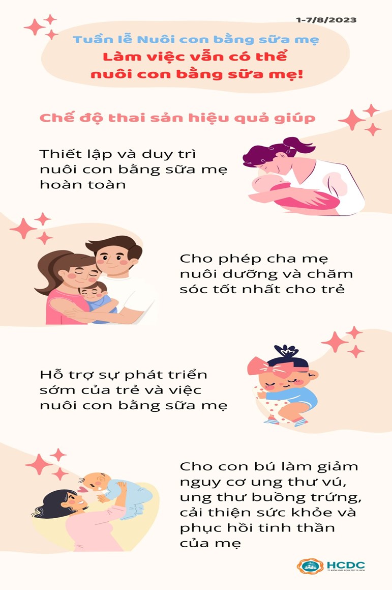 Tuần lễ Nuôi con bằng sữa mẹ năm 2023 (1-7/8/2023) kêu gọi các biện pháp bảo vệ thai sản hiệu quả giúp cải thiện sức khỏe của trẻ em và phụ nữ, đồng thời tăng cường nuôi con bằng sữa mẹ. Phụ nữ không cần phải lựa chọn giữa việc nuôi con bằng sữa mẹ và công việc của họ. Chế độ thai sản hiệu quả giúp: