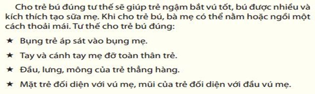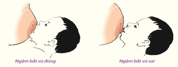 - Mặt trẻ quay vào vvu1 mẹ, mũi trẻ đối diện với núm vú.