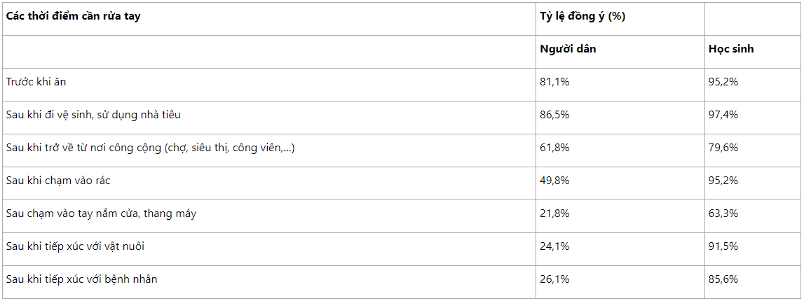 Như vậy, bên cạnh những thời điểm như trước khi ăn, sau khi đi vệ sinh, sau khi trở về từ nơi công cộng, cả người lớn và trẻ em đều cần tăng cường thói quen rửa tay vào các thời điểm khác như sau khi chạm vào tay nắm cửa, thang máy; Sau khi tiếp xúc với vật nuôi (chạm, cho vật nuôi ăn, dọn dẹp chất thải động vật); Trước và sau khi tiếp xúc, chăm sóc người bệnh có nôn mửa hoặc tiêu chảy tại nhà; Trước và sau khi điều trị vết thương; Trước, trong và sau khi chuẩn bị thức ăn, Sau khi thay tã hoặc tắm rửa cho trẻ đã đi vệ sinh; Sau khi xì mũi, ho hoặc hắt hơi [4].