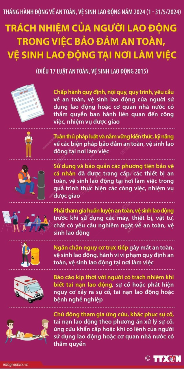 Hà Nội (TTXVN 3/5) Tháng hành động về an toàn, vệ sinh lao động diễn ra từ ngày 1 - 31/5/2024 với chủ đề “Tăng cường bảo đảm an toàn, vệ sinh lao động tại nơi làm việc và trong chuỗi cung ứng". Theo Điều 17 Luật An toàn, vệ sinh lao động 2015, để đảm bảo an toàn, vệ sinh lao động, người lao động có trách nhiệm: Chấp hành quy định, nội quy, quy trình, yêu cầu về an toàn, vệ sinh lao động của người sử dụng lao động hoặc cơ quan nhà nước có thẩm quyền ban hành liên quan đến công việc, nhiệm vụ được giao. Tuân thủ pháp luật và nắm vững kiến thức, kỹ năng về các biện pháp bảo đảm an toàn, vệ sinh lao động tại nơi làm việc; sử dụng và bảo quản các phương tiện bảo vệ cá nhân đã được trang cấp, các thiết bị an toàn, vệ sinh lao động tại nơi làm việc trong quá trình thực hiện các công việc, nhiệm vụ được giao…