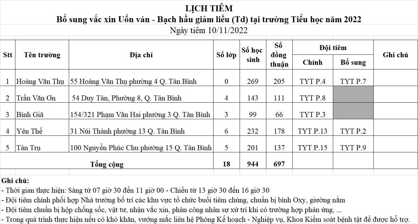 LỊCH TIÊM BỔ SUNG VẮC XIN UỐN VÁN - BẠCH HẦU GIẢM LIỀU (TD) TẠI TRƯỜNG TIỂU HỌC NĂM 2022 NGÀY 10/11/2022