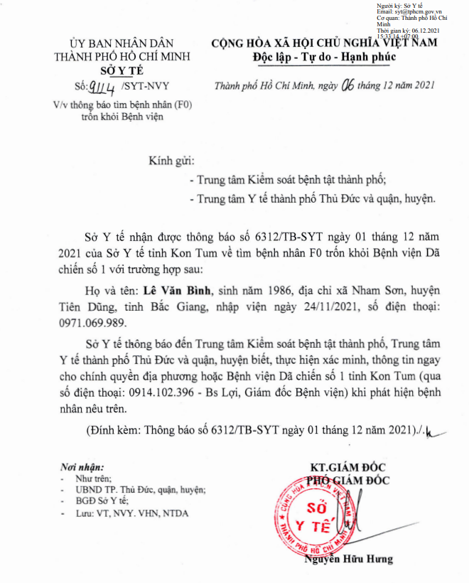 Thông báo tìm bệnh nhân (F0) trốn khỏi Bệnh viện