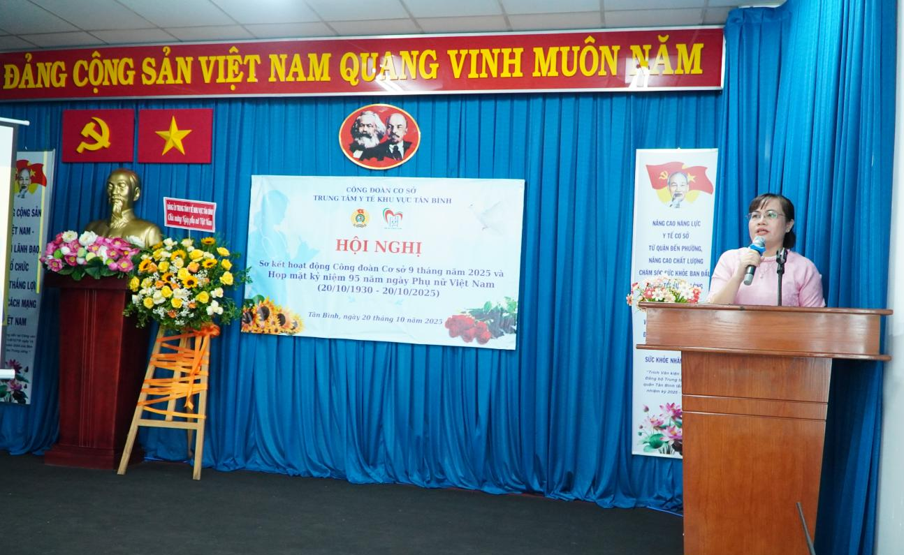 Ngày 20 tháng 10 năm 2025, Công đoàn cơ sở Trung tâm Y tế khu vực Tân Bình tổ chức Hội nghị sơ kết hoạt động Công đoàn Cơ sở 9 tháng năm 2025 và họp mặt kỷ niệm 95 năm ngày Phụ nữ Việt Nam (20/10/1930 - 20/10/2025). Đến dự có đồng chí Phan Văn Chính, Phó Bí thư Đảng ủy; đồng chí Trần Thị Thủy Cúc, Đảng ủy viên - Quyền Giám đốc Trung tâm Y tế khu vực Tân Bình và 60 đồng chí là Ủy viên Ban Chấp hành Công đoàn (BCHCĐ), Tổ trưởng tổ công đoàn, nữ công đoàn viên của Trung tâm Y tế.