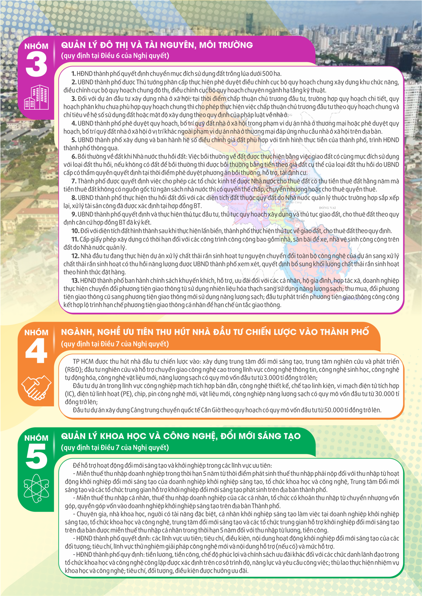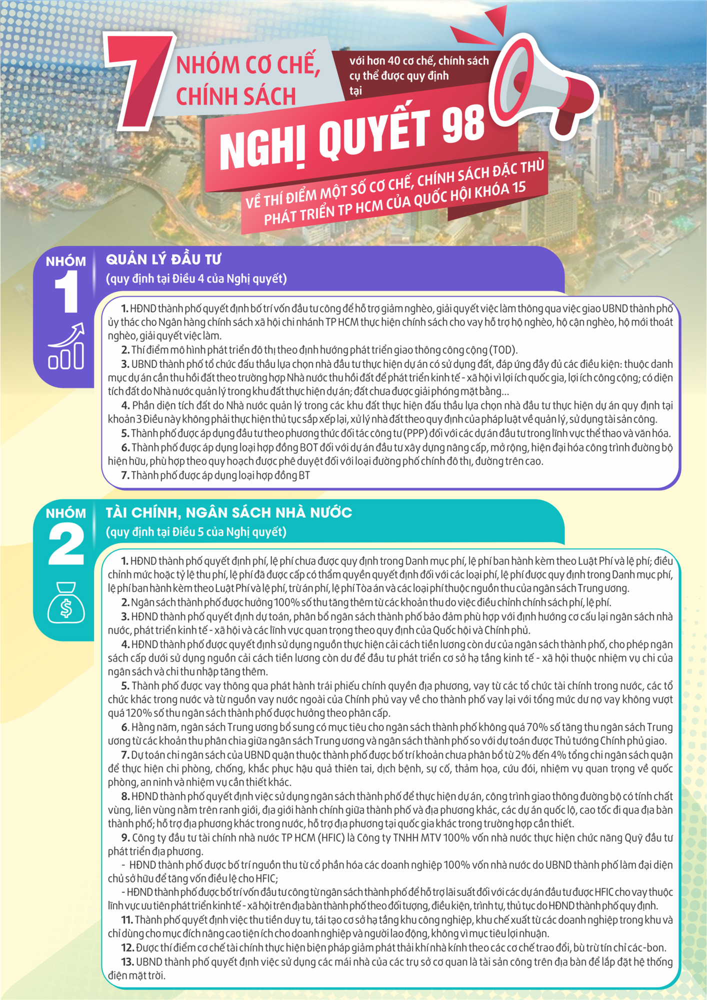 Chi tiết 7 nhóm cơ chế, chính sách với hơn 40 cơ chế, chính sách được quy định tại Nghị quyết 98 về thí điểm một số cơ chế, chính sách đặc thù phát triển TP HCM của Quốc hội khóa XV.