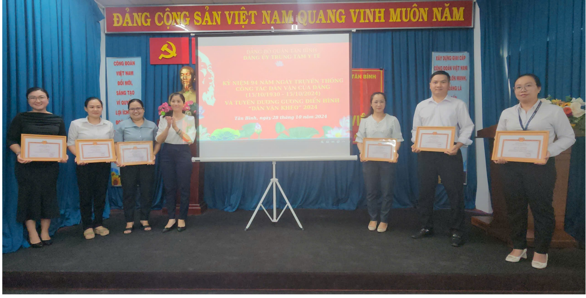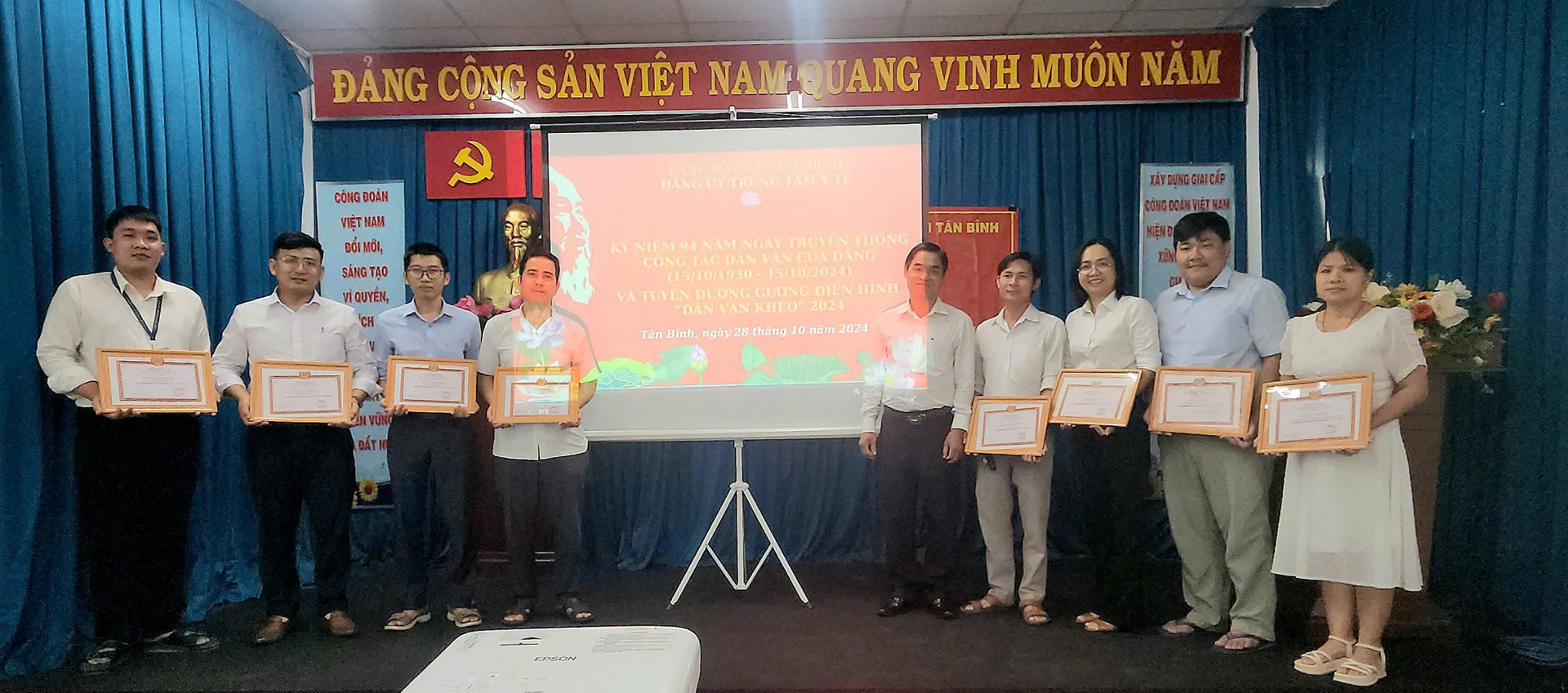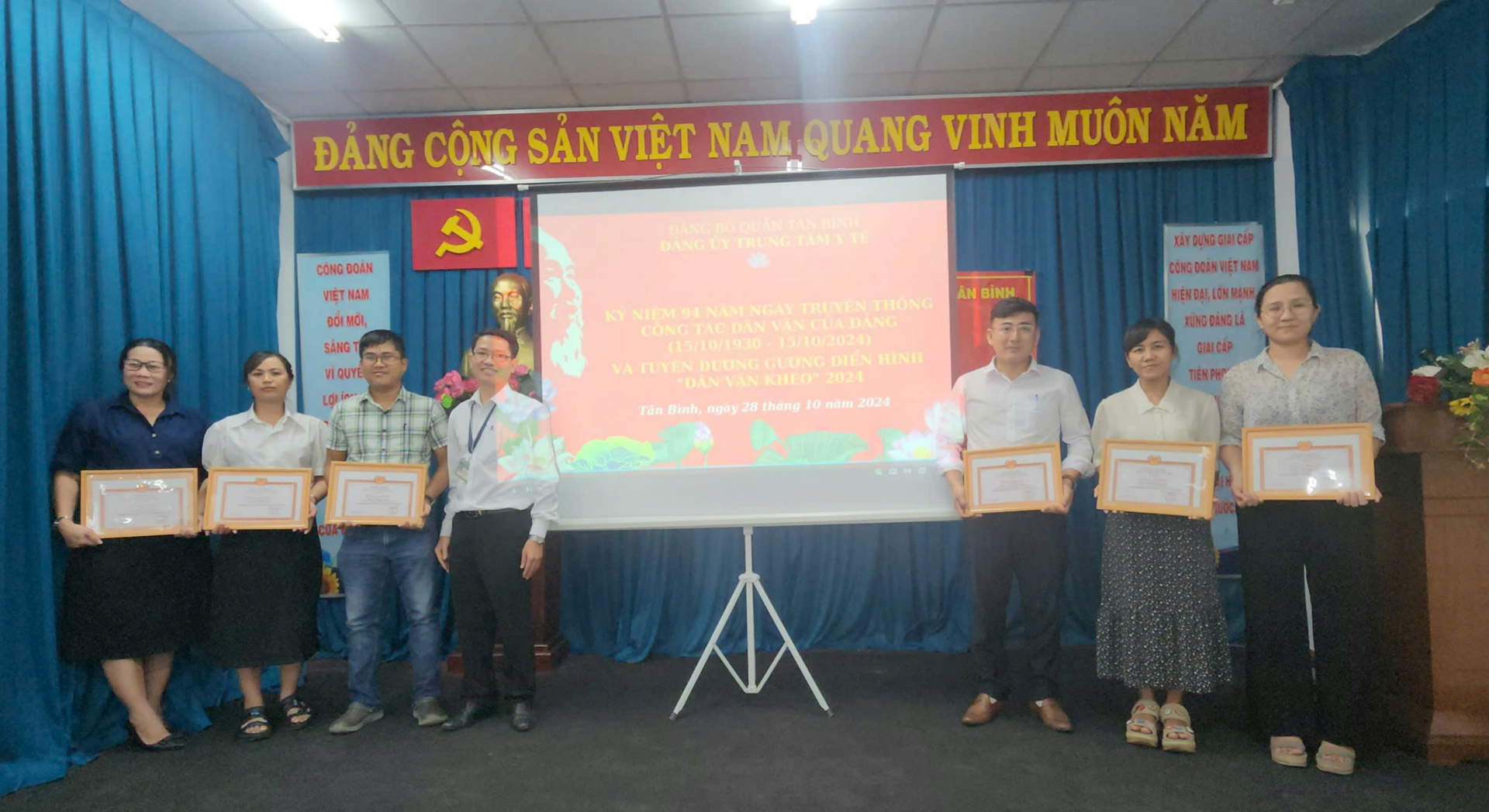 Tại hội nghị, Đảng ủy Trung tâm Y tế đã khen thưởng cho 8 tập thể và 12 cá nhân điển hình “Dân vận khéo” năm 2024, đây là những tập thể, cá nhân đã có những sáng kiến, phương pháp hay trong tổ chức thực hiện có hiệu quả công tác Dân vận tại đơn vị, nhất là đẩy mạnh các phong trào thi đua góp phần hoàn thành nhiệm vụ chăm sóc sức khỏe nhân dân, góp phần phát triển kinh tế - văn hóa - xã hội, quốc phòng - an ninh; tăng cường khối đại đoàn kết toàn dân tộc trên địa bàn quận Tân Bình./.