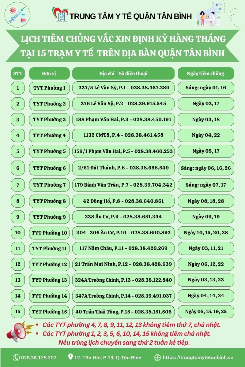 Lịch tiêm chủng vắc xin tại 15 trạm y tế trên địa bàn quận Tân Bình
