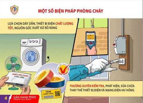 - Đối với mỗi hộ gia đình phải thường xuyên kiểm tra, thay thế các đường dây điện đã cũ. Mỗi hộ dân nên trang bị 01 đến 02 bình chữa cháy xách tay bằng bột hoặc khí, bảo đảm về chất lượng. Khi xảy ra cháy do sử dụng điện phải nhanh chóng cắt cầu dao điện tổng, báo Cảnh sát PCCC theo số 114 hoặc các cơ quan chức năng gần nhất và dùng phương tiện chữa cháy tại chỗ dập lửa như bình chữa cháy xách tay, cấm dùng nước dập lửa khi chưa cắt điện.