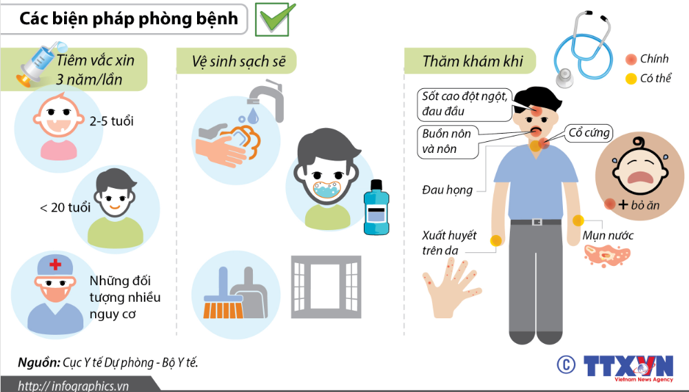 - Chủ động tiêm vắc xin phòng bệnh do não mô cầu tại các cơ sở y tế cho trẻ từ 2 tuổi trở lên và người lớn với 1 liều duy nhất, sau đó tiêm nhắc mỗi 3 năm.