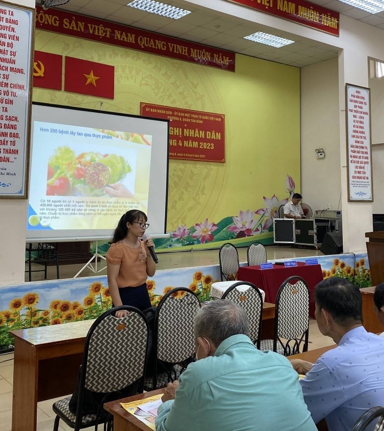 Báo cáo viên ThS. Lê Thị Hồng Lý đã tuyên truyền về chính sách, pháp luật, kiến thức về an toàn thực phẩm, cách lựa chọn các loại thực phẩm, hướng dẫn bảo đảm an toàn điều kiện vệ sinh cơ sở, trang thiết bị, dụng cụ sơ chế, chế biến thực phẩm và 10 nguyên tắc vàng chế biến thực phẩm an toàn trong việc phòng ngừa ô nhiễm thực phẩm và các bệnh truyền qua thực phẩm.