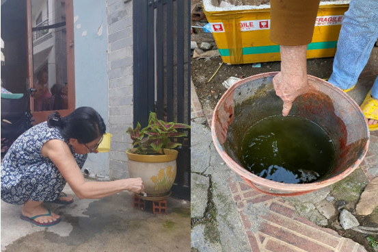 Cộng tác viên sức khỏe cộng đồng xử lý các vật chứa nước có lăng quăng