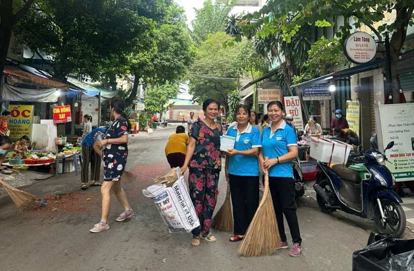 Cộng tác viên sức khỏe cộng đồng và người dân dọn dẹp vệ sinh môi trường