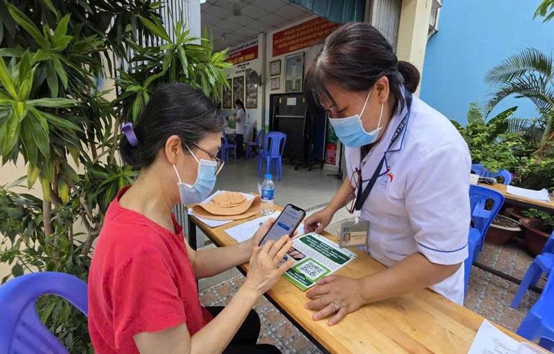 Nhân viên Y tế hướng dẫn NCT quét mã khảo sát kiến thức về phòng, chống dịch bệnh SXH, TCM