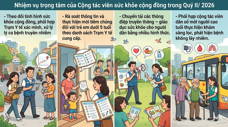 Về triển khai hoạt động chăm sóc sức khỏe cộng đồng, Ths Lê Thị Châu An, Trưởng khoa Phòng bệnh, an toàn thực phẩm đã triển khai các công tác trọng tâm trong Quý II năm 2026: