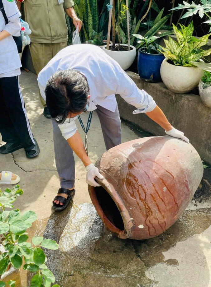 Ông Trần Văn Thọ - Trưởng trạm Y tế phường kiểm tra điểm nguy cơ và hướng dẫn loại bỏ các vật dụng chứa nước phát sinh lăng quăng