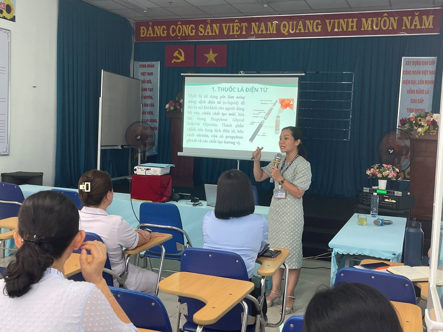 Tại hội nghị, Báo cáo viên Bác sĩ Nguyễn Thị Hồng Anh đã chia sẻ những tác hại của thuốc lá, đặc biệt là tác hại của thuốc lá điện tử, thuốc lá nung nóng…, các quy định của Luật Phòng, chống tác hại thuốc lá; hướng dẫn cách nhận diện và ngăn chặn việc sử dụng thuốc lá điện tử trong lứa tuổi thanh thiếu niên hiện nay đặc biệt là tại các trường học nhằm hưởng ứng Tuần lễ quốc gia không thuốc lá từ 25-31/5/2024 và ngày thế giới không thuốc lá 31/5/2024 với chủ đề: “Bảo vệ trẻ em trước những tác động của ngành công nghiệp thuốc lá”.
