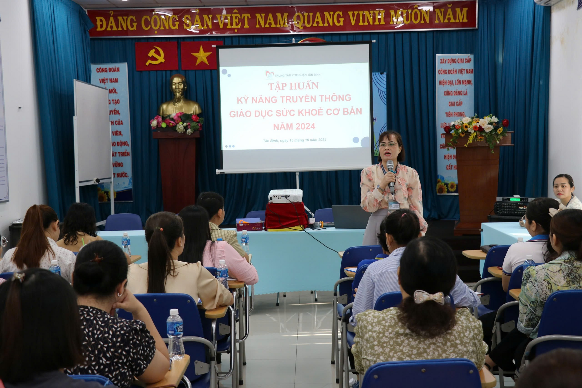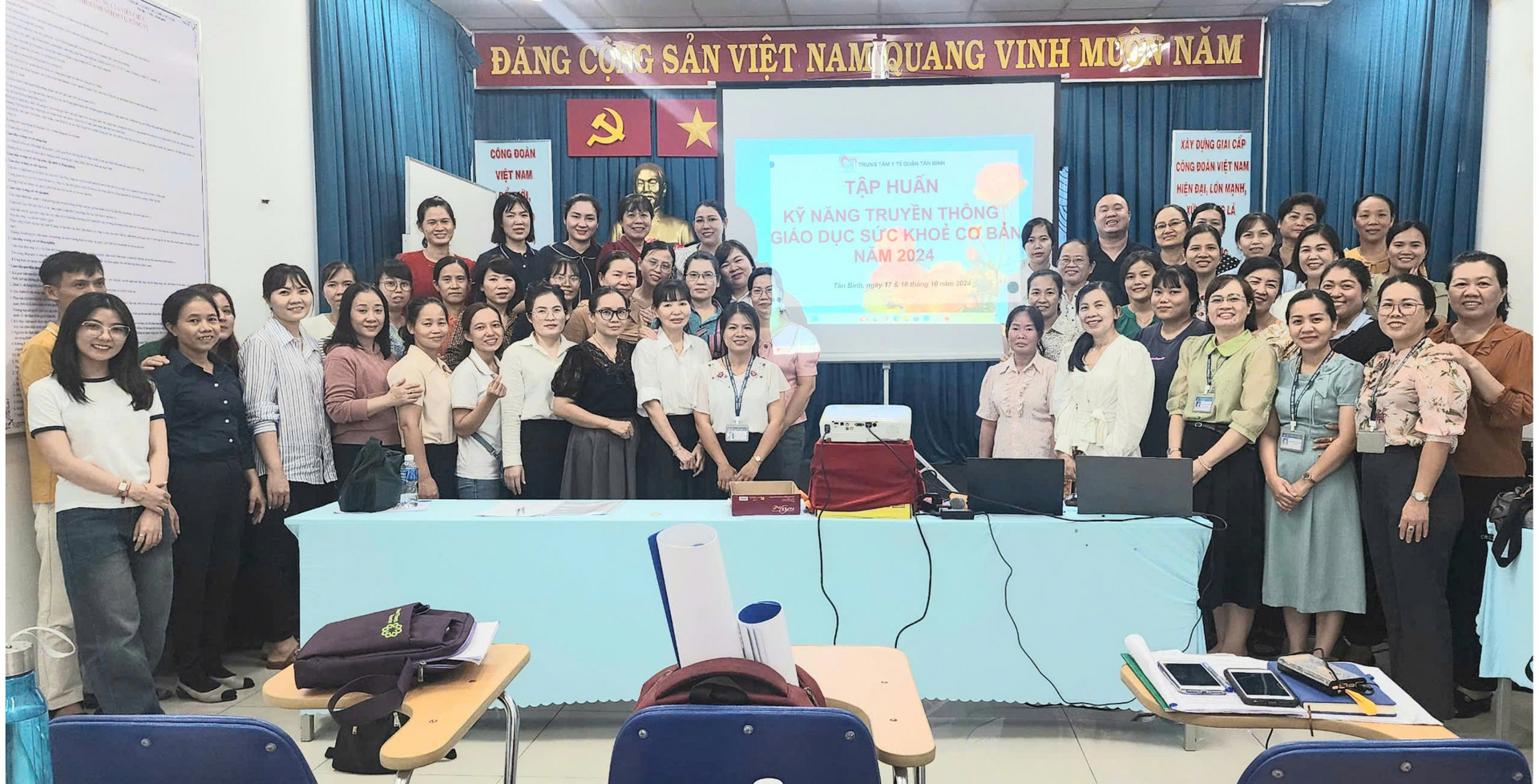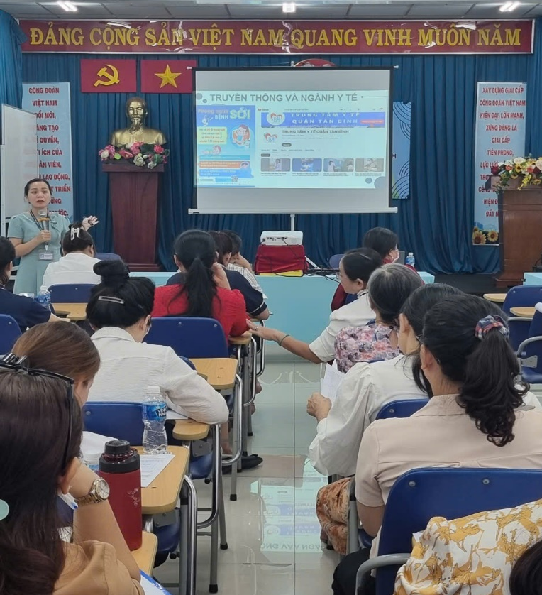 Ngày 15&16/10/2024(lớp 1) và ngày 17&18/10/2024(lớp 2) Trung tâm Y tế quận Tân Bình tổ chức 2 lớp tập huấn “Kỹ năng truyền thông giáo dục sức khỏe cơ bản” năm 2024 với sự tham dự của Thạc sĩ Đào Thị Thanh Nga, Trưởng phòng Dân số - Truyền thông và Giáo dục sức khỏe, Trung tâm Y tế cùng với hơn 100 nhân sự phụ trách truyền thông y tế trường học (T2G) tham gia tập huấn. Lớp 1 đối với nhân sự phụ trách khối học Mầm non, Trung học phổ thông; lớp 2 đối với nhân sự phụ trách khối học Tiểu học, Trung học cơ trên địa bàn quận.