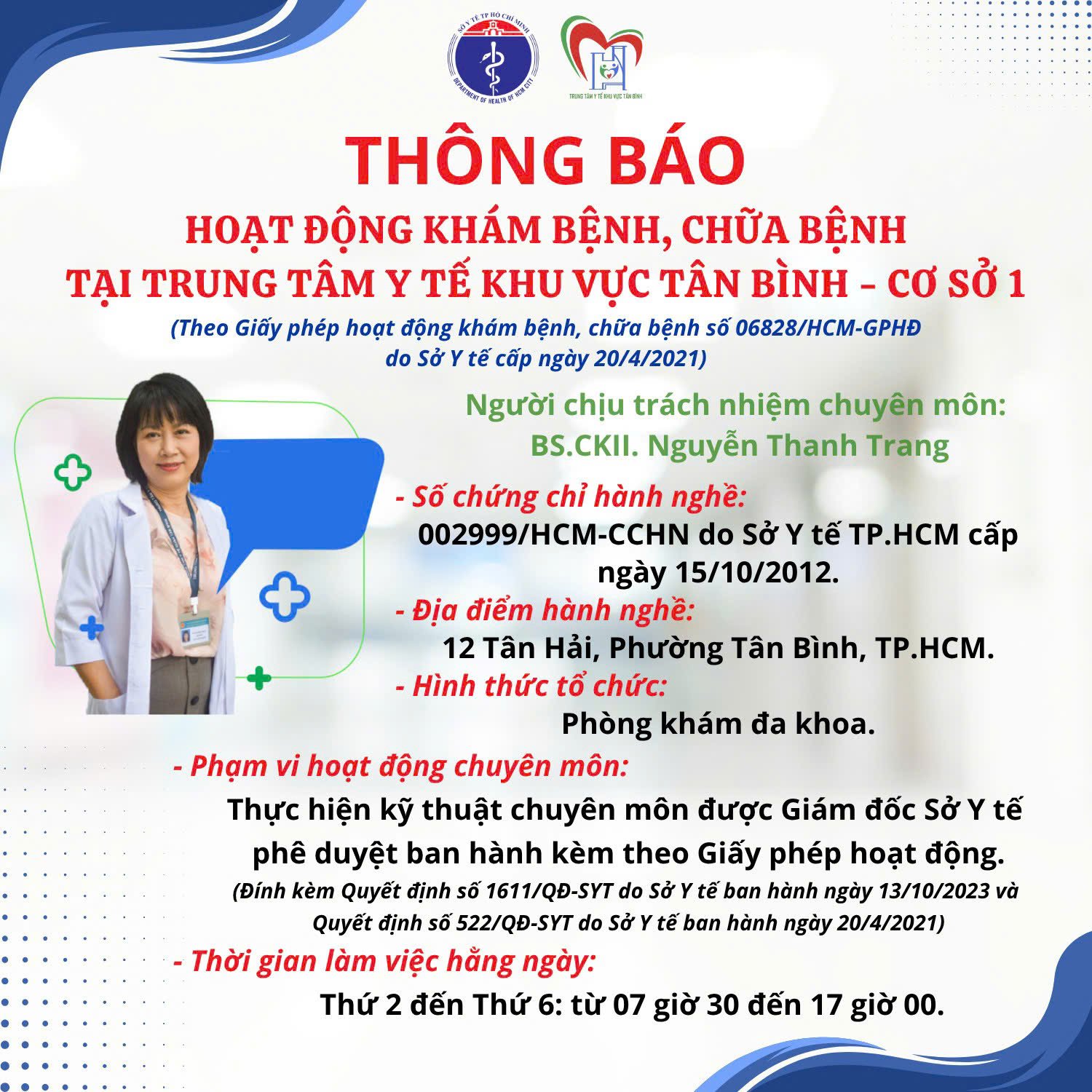 Thông báo Hoạt động khám bệnh, chữa bệnh tại Trung tâm Y tế khu vực Tân Bình - Cơ sở 1
