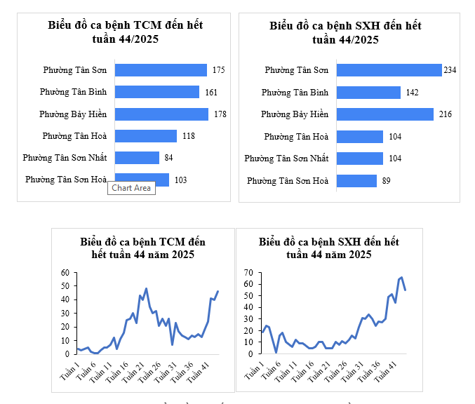 Trong tuần 44, ghi nhận 55 ca mắc sốt xuất huyết, giảm 1,7% so với trung bình 4 tuần trước (56 ca). Ca bệnh xuất hiện trên địa Phường Tân Sơn Hoà, Phường Tân Sơn Nhất, Phường Tân Hoà, Phường Bảy Hiền, Phường Tân Bình, Phường Tân Sơn.