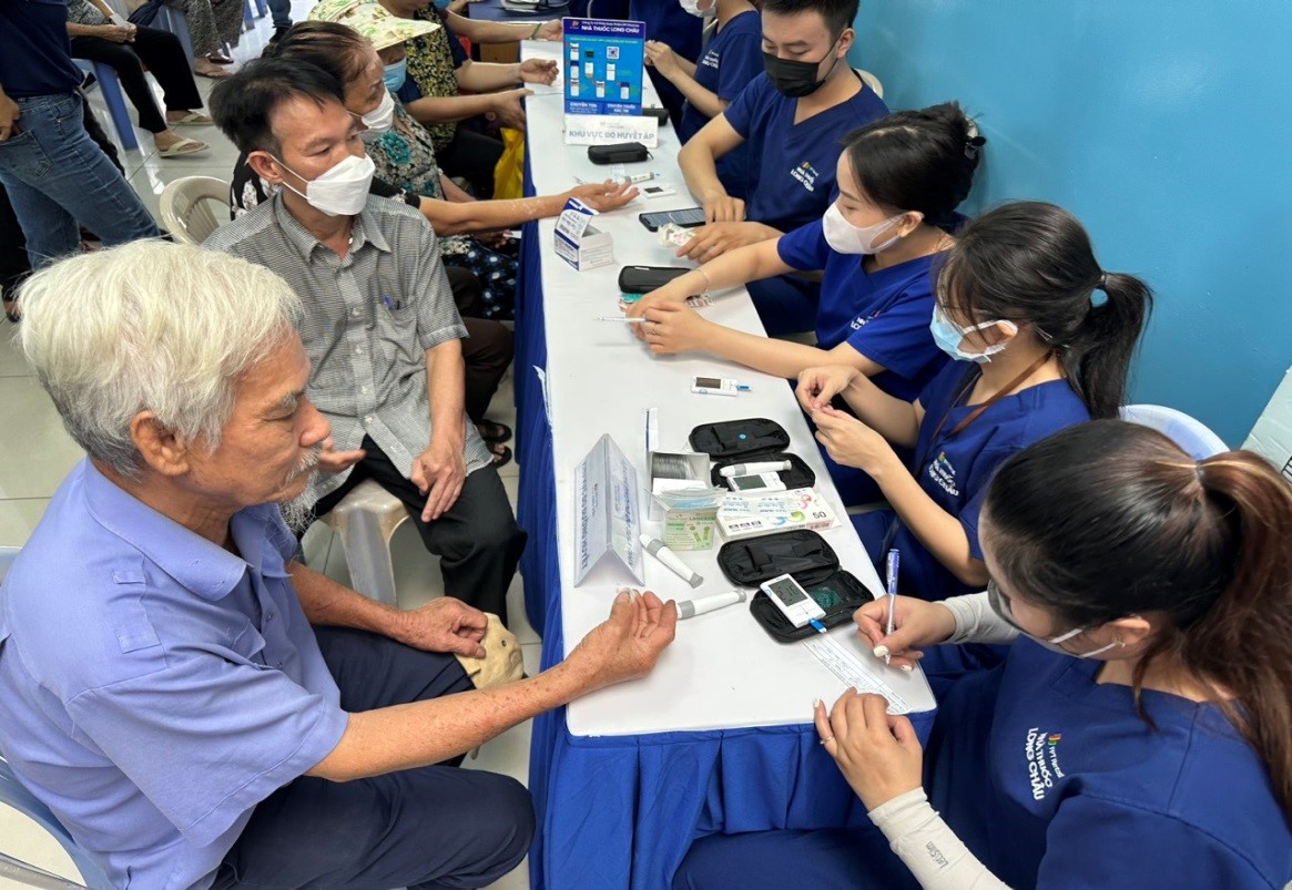 Nhân viên y tế xét nghiệm đường huyết cho người dân