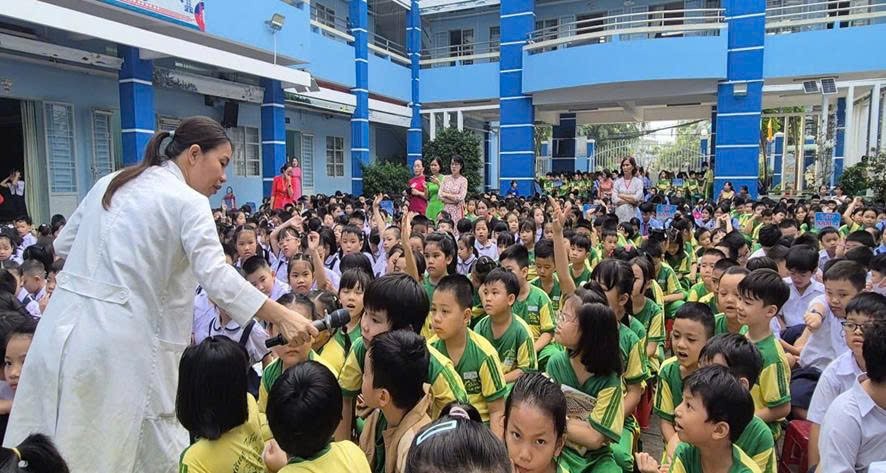 Song song đó, Bs Quyên trình bày các kiến thức về bệnh sốt xuất huyết, giúp người tham dự hiểu rõ đặc điểm bệnh, dấu hiệu cảnh báo, đặc tính của muỗi vằn – trung gian truyền bệnh. Giáo viên và học sinh được hướng dẫn thực hành các biện pháp diệt muỗi, diệt lăng quăng, dọn dẹp vệ sinh môi trường, đậy kín và súc rửa dụng cụ chứa nước để loại bỏ nơi sinh sản của muỗi.