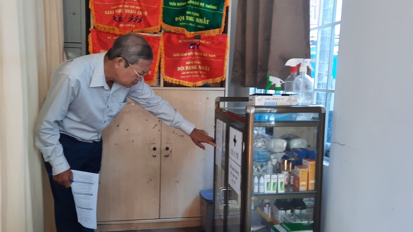 Ông Trương Sơn kiểm tra danh mục, hạn sử dụng của tủ thuốc y tế được Trường bố trí tại một góc Y tế.