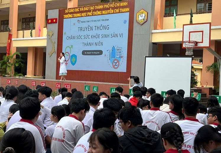 Song song các hoạt động hưởng ứng Ngày Dân số Việt Nam, trước đó vào ngày 13/10 và 20/10/2025, Trung tâm Y tế khu vực Tân Bình phối hợp Ban Giám hiệu Trường Trung học phổ thông (THPT) Nguyễn Chí Thanh và Trường THPT Nguyễn Thượng Hiền tổ chức buổi truyền thông về Sức khỏe Vị Thành niên với sự tham gia hơn 400 học sinh của 2 trường. Báo cáo viên buổi truyền thông là Bác sĩ Nguyễn Thị Hồng Anh – Phòng Truyền thông và Giáo dục sức khỏe và Bác sĩ Ngô Thu Phương - Khoa Chăm sóc sức khỏe sinh sản và phụ sản – Dân số và phát triển.