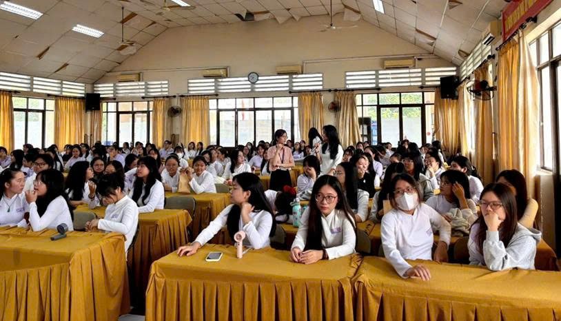 Bác sĩ Ngô Thu Phương báo cáo viên buổi truyền thông tại Trường PTTH Nguyễn Thượng Hiền