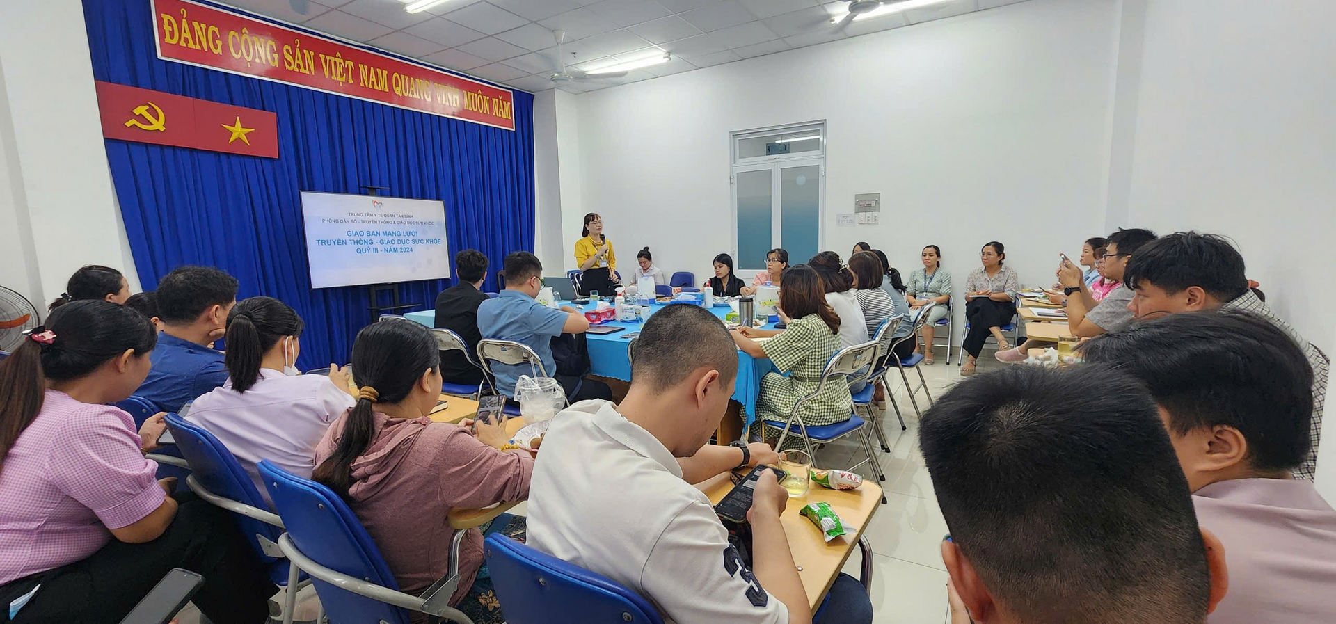 Ngày 11/10/2024 Trung tâm Y tế quận Tân Bình tổ chức hội nghị giao ban mạng lưới truyền thông giáo dục sức khỏe Quý 3 năm 2024 với sự tham gia 33 viên chức là trưởng hoặc phó điều hành của 15 trạm y tế phường và nhân viên phụ trách công tác truyền thông giáo dục sức khỏe tại đơn vị, chủ trì hội nghị là Ths. Đào Thị Thanh Nga, Trưởng Phòng Dân số - Truyền thông và Giáo dục sức khỏe (DS-TT&GDSK).