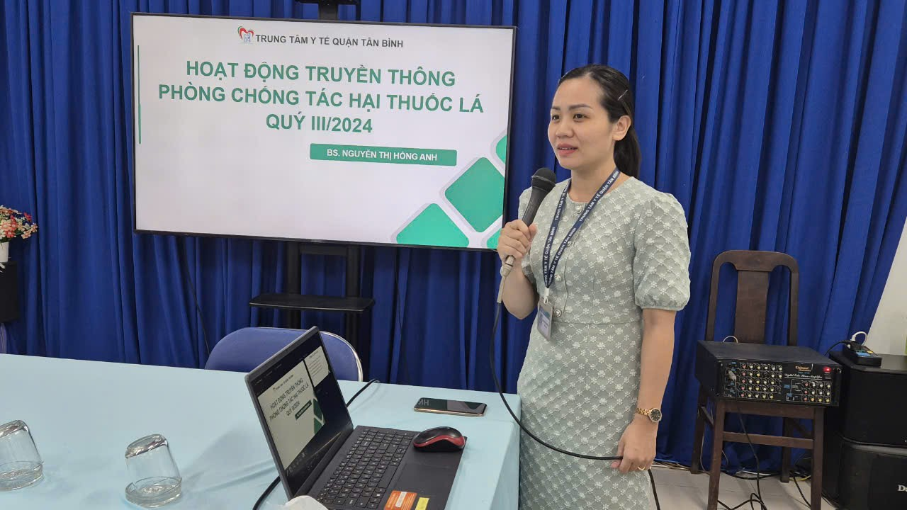 Đối với chương trình phòng chống tác hại thuốc lá (PCTHTL) bác sĩ Nguyễn Thị Hồng Anh báo cáo kết quả đánh giá thực hiện chương trình PCTHTL tại các đơn vị trong quý, đồng thời hướng dẫn các đơn vị thực hiện chế độ báo cáo theo hướng dẫn mới của Trung tâm kiểm soát bệnh tật thành phố (HCDC); triển khai kế hoạch tổ chức tập huấn truyền thông PCTHTL trên địa bàn quận Tân Bình dự kiến tổ chức trong tháng 10, 11 năm 2024 và Kế họach Hội thi tìm hiểu kiến thức và Luật phòng, chống tác hại thuốc lá, rượu bia trên địa bàn quận Tân Bình.