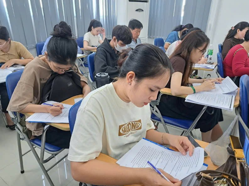 Người tham gia tập huấn làm bài kiểm tra lượng giá kiến thức cuối khoá