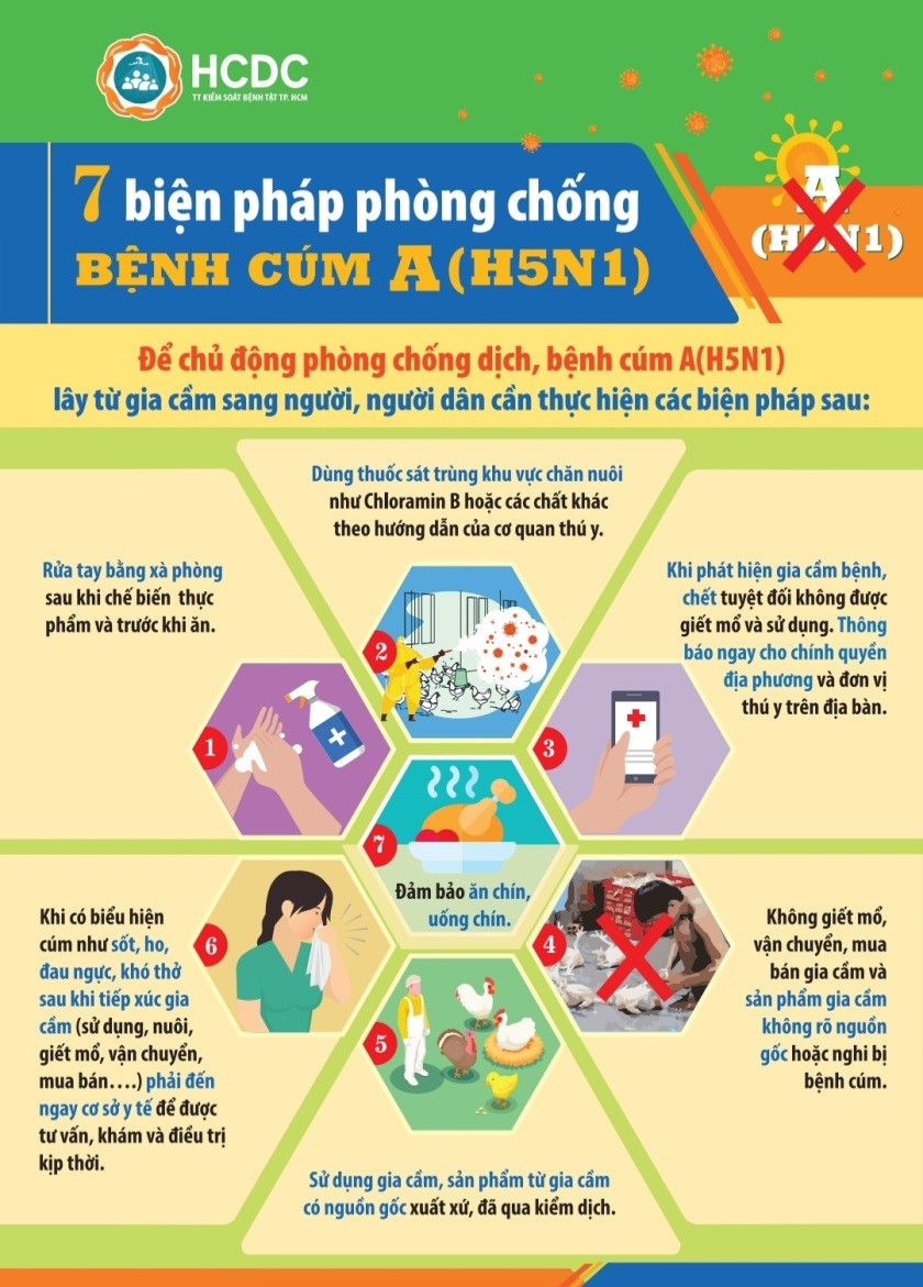 Hiện nay, theo hướng dẫn của HCDC (Trung tâm Kiểm soát bệnh tật Thành phố), để chủ động phòng, chống bệnh cúm A (H5N1) lây từ gia cầm sang người, cần thực hiện 7 biện pháp sau: