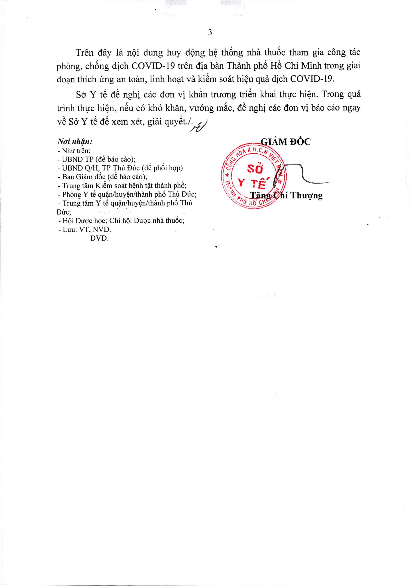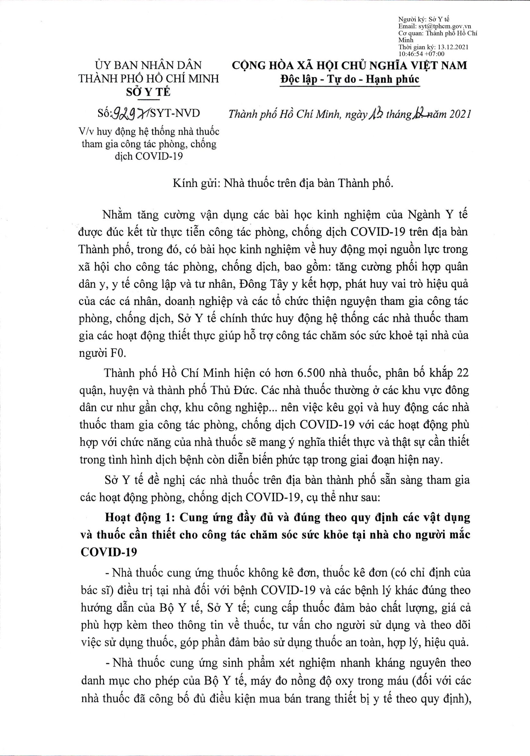 Đại dịch COVID-19 đã và đang đe dọa đến sự an toàn và sức khỏe mọi nhà. Do đó, cần có sự chung sức, đồng lòng chống dịch của tất cả mọi ngành nghề. Trên tinh thần đó, ngày 13/12/2021, Sở Y tế TP. Hồ Chí Minh đã ra công văn số 9297/SYT-NVD về việc huy động hệ thống nhà thuốc tham gia công tác phòng, chống dịch COVID-19.