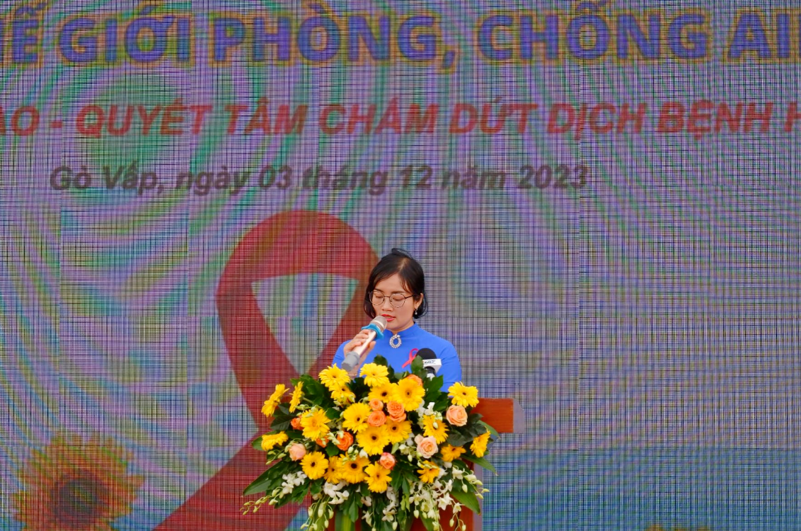 Phát biểu hưởng ứng tại buổi lễ, bà Đào Thị My Thư cho biết các nỗ lực tiếp cận cộng đồng của Quận Gò Vấp đã đạt được những kết quả trong việc chăm sóc và phòng ngừa HIV/AIDS trong năm 2023. Với hơn 10.000 lượt đối tượng thuộc nhóm nguy cơ cao, chương trình đã chuyển gửi 6.280 lượt khách hàng đến làm xét nghiệm sàng lọc HIV. Kết quả là phát hiện 254 trường hợp dương tính, từ đó kết nối người bệnh vào chương trình điều trị; có 854 khách hàng tích cực tham gia chương trình dự phòng trước phơi nhiễm với HIV. Hiện nay, tổng số bệnh nhân HIV/AIDS được theo dõi và quản lý điều trị ARV tại Quận Gò Vấp là 2.702 bệnh nhân, với tỷ lệ sử dụng dịch vụ qua bảo hiểm y tế đạt 94,7%. Đồng thời, chương trình Methadon hiện có 374 bệnh nhân đang tham gia, trong đó có 48 bệnh nhân đang tham gia nghiên cứu AMOHI. Quận Gò Vấp còn là một trong những địa phương đầu tiên triển khai phòng khám "Một điểm đến – Đa dịch vụ" tại Khoa Tư vấn, điều trị nghiện chất & HIV/AIDS thuộc Trung tâm y tế. Hơn 3.000 khách hàng đã đến nhận dịch vụ trong vòng 2 năm hoạt động.