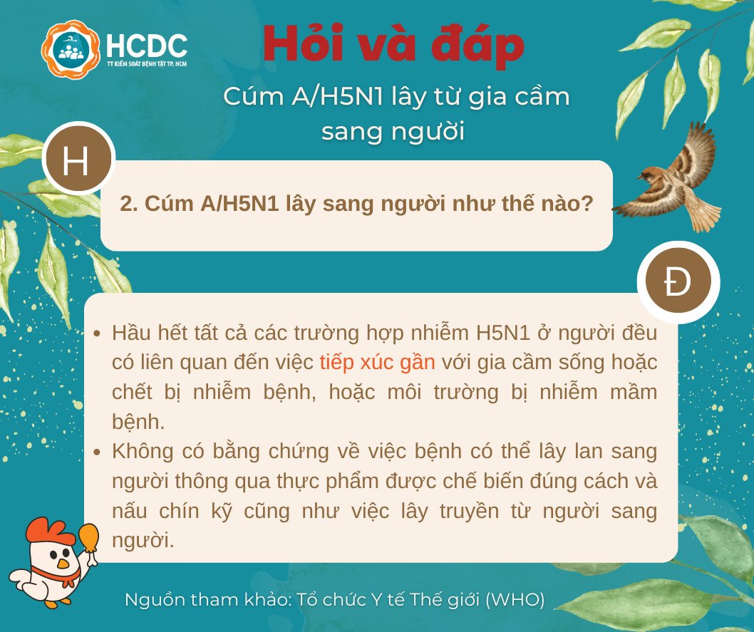 Hầu hết tất cả các trường hợp nhiễm H5N1 ở người đều có liên quan đến việc tiếp xúc gần với gia cầm sống hoặc chết bị nhiễm bệnh, hoặc môi trường bị nhiễm mầm bệnh.