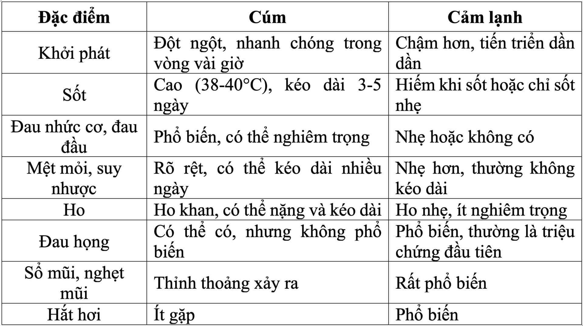 Cúm và cảm lạnh thông thường có nhiều triệu chứng giống nhau, nhưng chúng là hai bệnh khác nhau về nguyên nhân, mức độ nghiêm trọng và cách điều trị. Dưới đây là những điểm khác biệt chính: