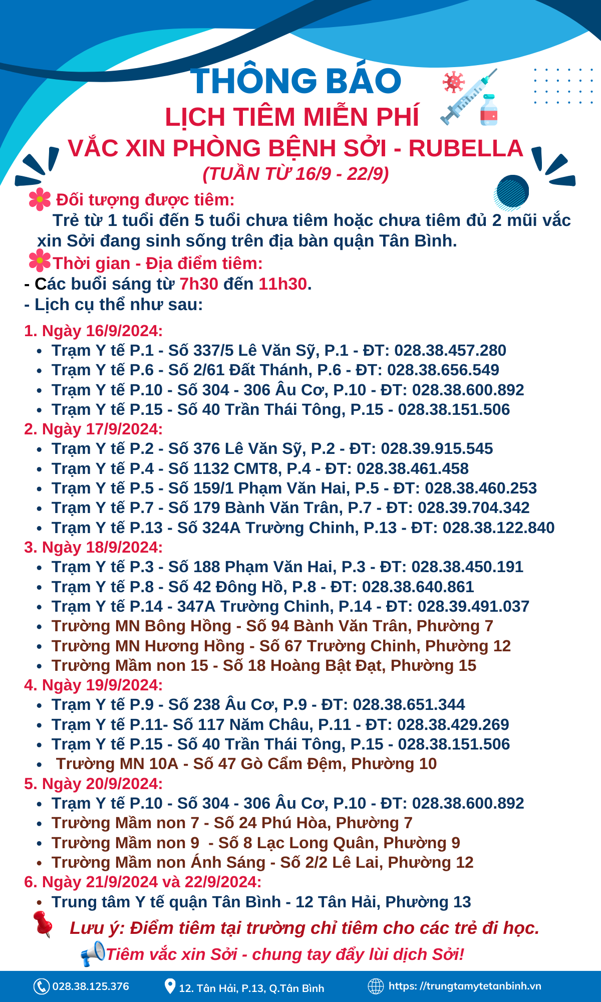 LỊCH TIÊM MIỄN PHÍ VẮC XIN PHÒNG BỆNH SỞI - RUBELLA (TUẦN TỪ 16/9 - 22/9/2024)