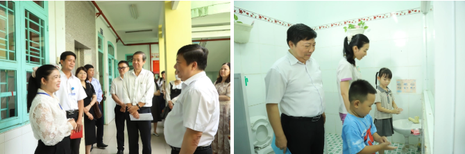Đoàn kiểm tra công tác phòng chống dịch tại trường học. Ảnh: P.Thương.