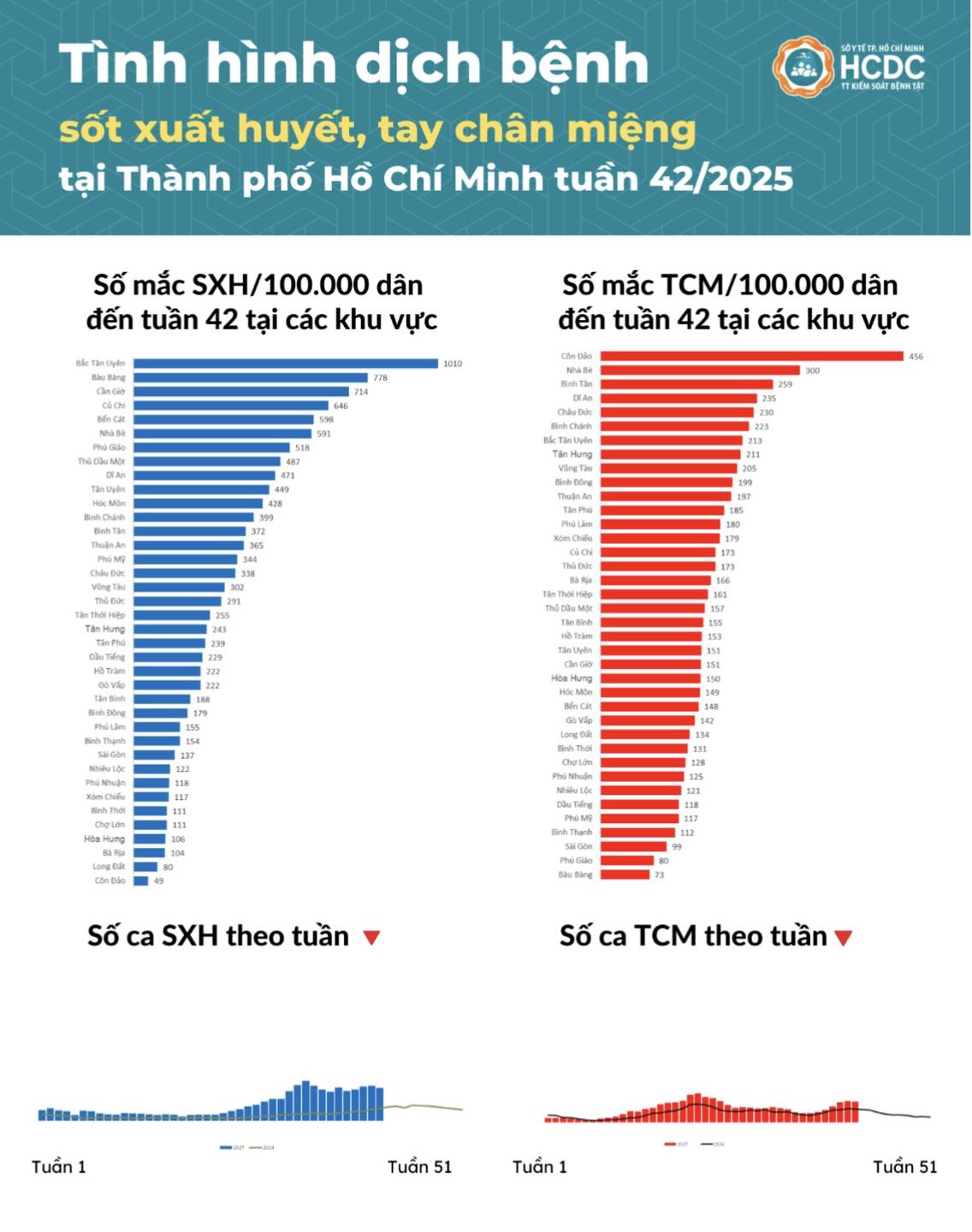 Trong tuần 42, TP. Hồ Chí Minh cũng ghi nhận 931 trường hợp mắc bệnh tay chân miệng, tăng 18,4% so với trung bình 4 tuần trước. Tổng số ca tay chân miệng tích lũy từ đầu năm 2025 đến tuần 42 là 25.453 ca. Các khu vực có số ca mắc tay chân miệng trên 100.000 dân cao bao gồm Côn Đảo, Nhà Bè và Bình Tân.