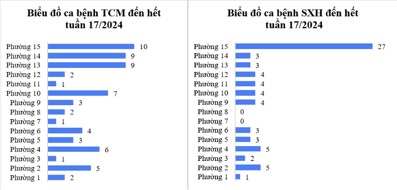 Trong tuần 17, ghi nhận 5 ca mắc sốt xuất huyết, tăng 25% so với trung bình 4 tuần trước (4 ca). Ca bệnh xuất hiện trên địa bàn Phường 4, Phường 11 và Phường 15 (3 ca).