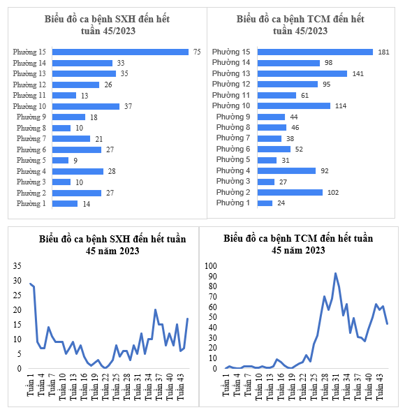 Trong tuần 45, quận Tân Bình cũng ghi nhận 17 ca bệnh sốt xuất huyết, tăng 88,89% so với trung bình 4 tuần gần nhất (9 ca). Các phường có ca sốt xuất huyết tăng so với tuần trước đó là Phường 15 (tăng 3 ca), Phường 8 (tăng 2 ca), Phường 9 (tăng 2 ca).