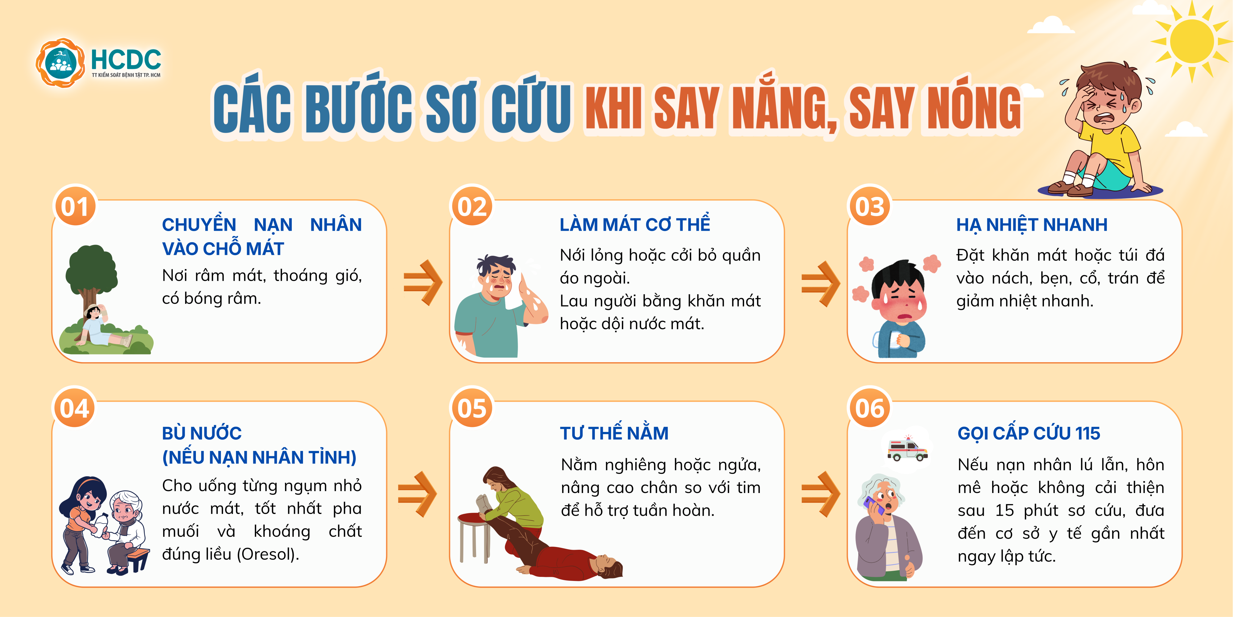 Infographic dưới đây hướng dẫn các bước sơ cứu cơ bản, dễ thực hiện giúp hạ nhiệt cơ thể, hỗ trợ hồi phục và hạn chế biến chứng. Việc nhận biết sớm và xử trí đúng cách sẽ giúp bảo vệ an toàn cho bản thân và những người xung quanh trong mùa nắng nóng.