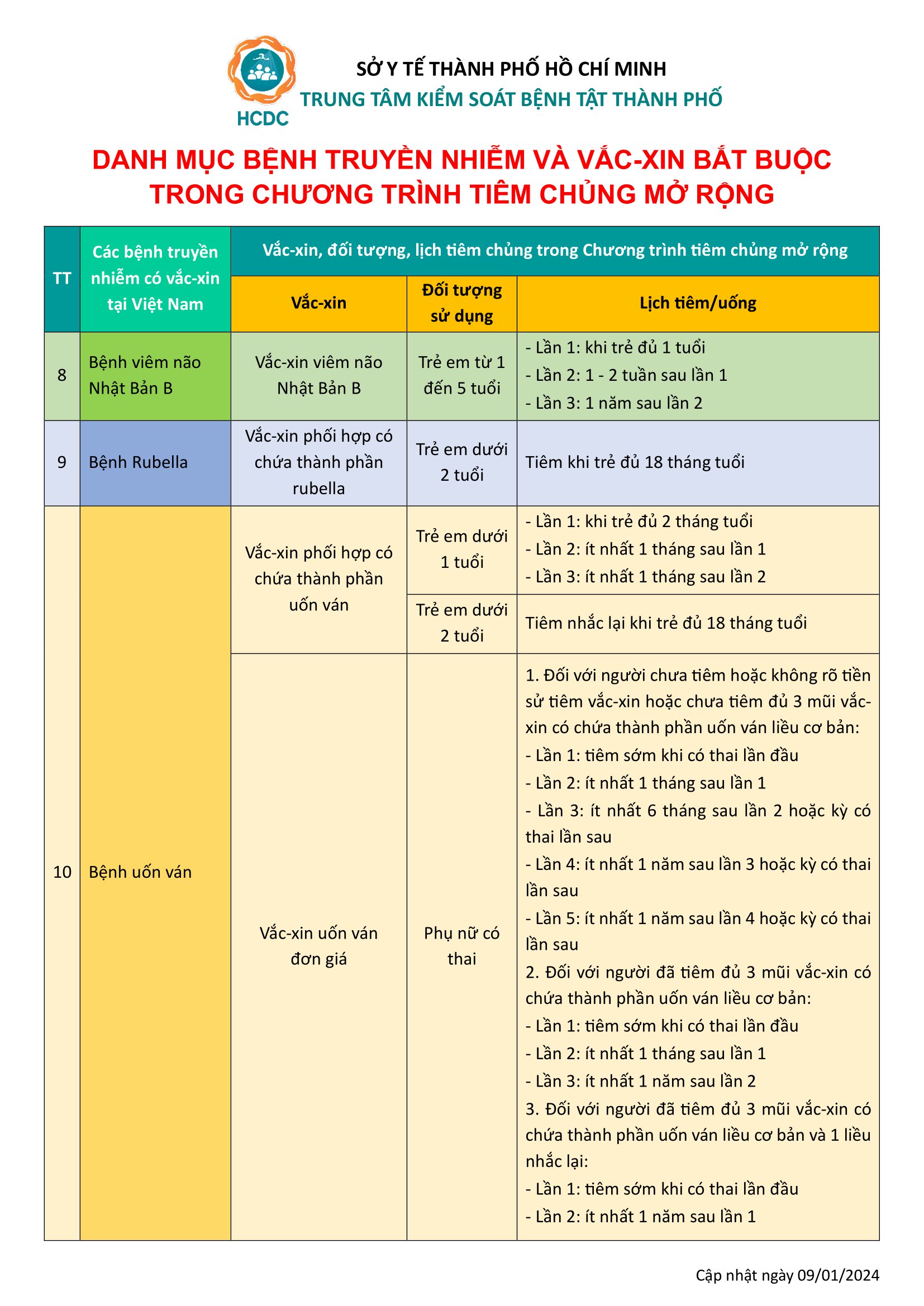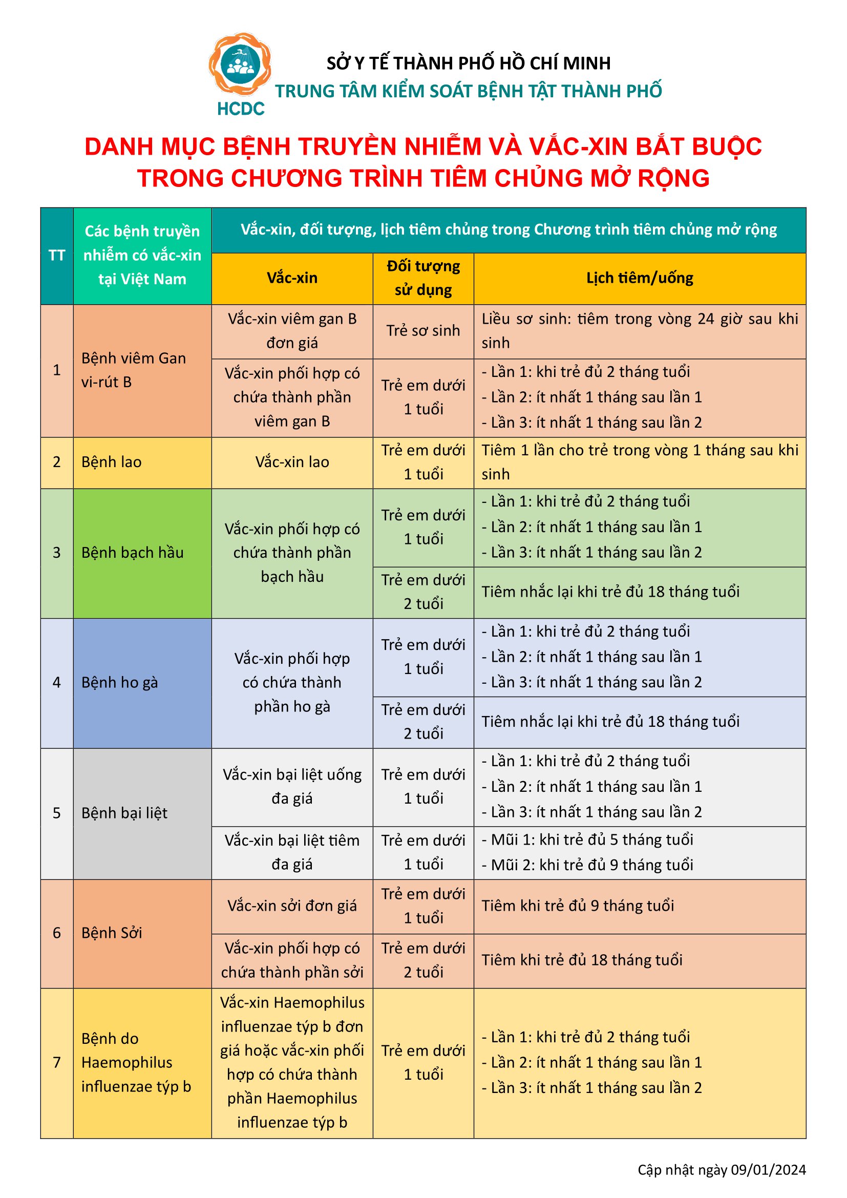 Danh mục bệnh truyền nhiễm và vắc-xin bắt buộc trong Chương trình Tiêm chủng mở rộng bao gồm: Viêm gan B, Lao, Bạch hầu, Ho gà, Uốn ván, Bại liệt, Bệnh do Heamophilus Inffluenzae týp B, Sởi, Viêm não Nhật Bản, Rubella.