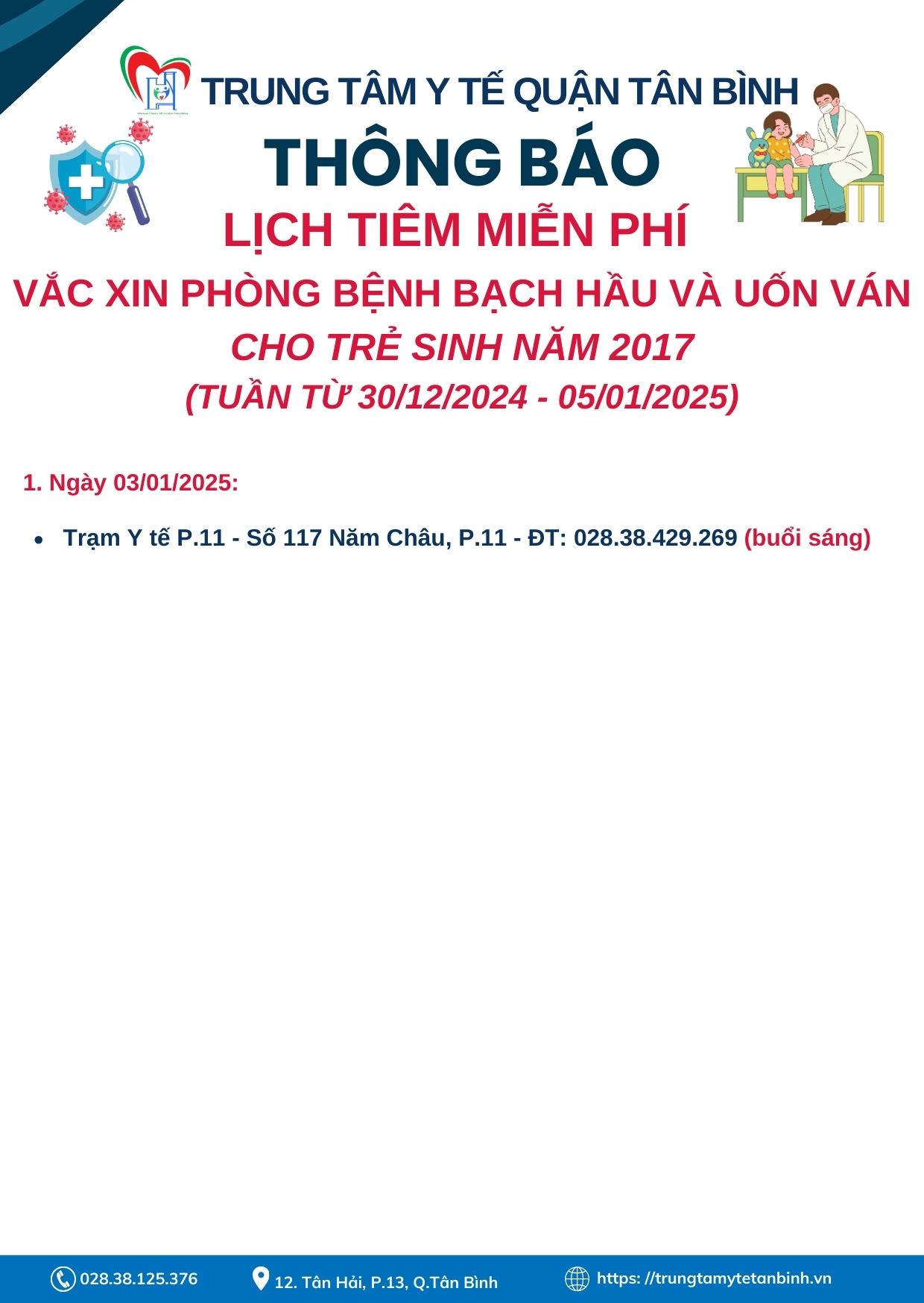 Lịch tiêm miễn phí vắc xin phòng bệnh bạch hầu và uốn ván cho trẻ sinh năm 2017 (từ ngày 30/12/2024 đến ngày 05/01/2025)