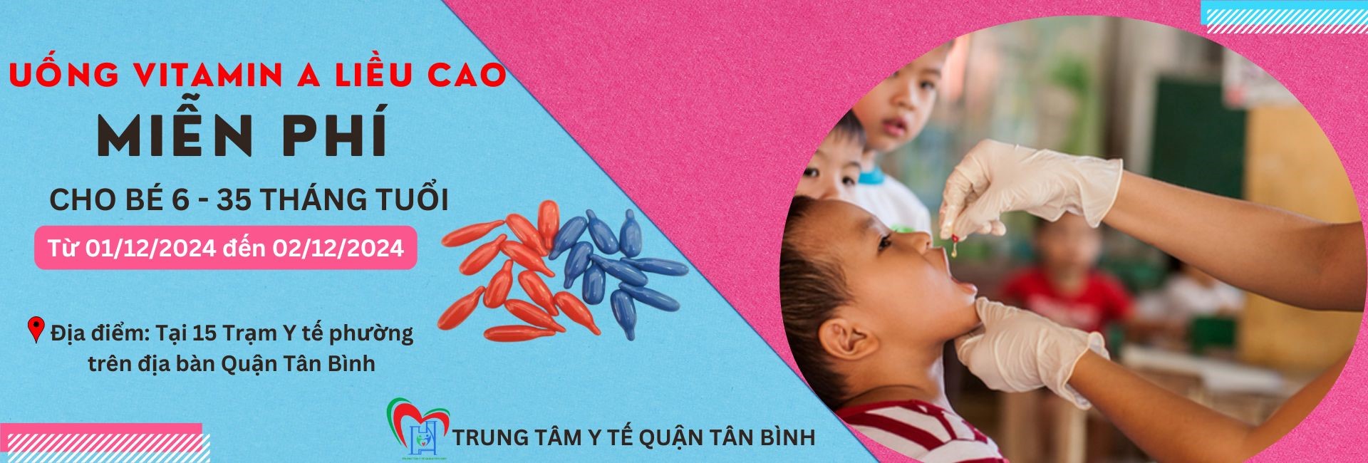 Từ ngày 01 và 02/12/2024, Quận Tân Bình sẽ triển khai Chiến dịch bổ sung Vitamin A cho trẻ em đợt 2 năm 2024 cho trẻ em từ 6 tháng đến 35 tháng tuổi. Phụ huynh hãy đưa trẻ trong độ tuổi đi uống vitamin A theo hướng dẫn của Trạm Y tế phường.