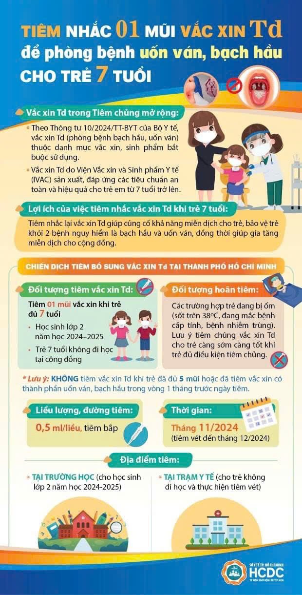 Tiêm nhắc 01 mũi vắc xin Td để phòng bệnh uốn ván, bạch hầu cho trẻ 7 tuổi